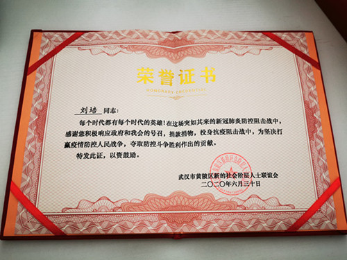 🔼黄陂区新联会副会长刘培在抗疫表彰会上获得荣誉 积小善为大善,积小德为大德 !在此次防控新冠肺炎的战“疫”中,全国道德模范、武汉市黄陂区新联会副会长刘培,逆风而行,勇当先锋,坚持奋战在一线,用实际行动为抗击疫情奉献着自己的力量。