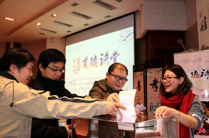一段耳熟能详、脍炙人口的经典古语感染着现场观众,刘培、刘洋兄弟的勇气和孝心引起了师生们的热议和共鸣,大家踊跃发言,畅谈感受和体会。15级学生聂婉月讲到了感动中国人物中一个身患癌症的母亲,为了给儿女筹学费,坚持忍痛41个月绣出巨幅《清明上河图》,无疆的母爱让每个人都深受触动。有学生说:“刘培的事迹感人至深,我家庭经济条件不好,亲人得了重病,这次得到学校的助学金,感受到了学校的关怀,在今后的学习和生活中,我要以刘培老师为榜样和楷模,更加努力学习,以实际行动回报父母、回报社会。”